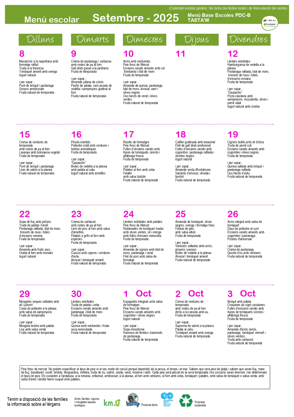 Aquest és l’espai on podeu consultar la varietat de menús que oferim al menjador de l’escola durant el curs escolar.